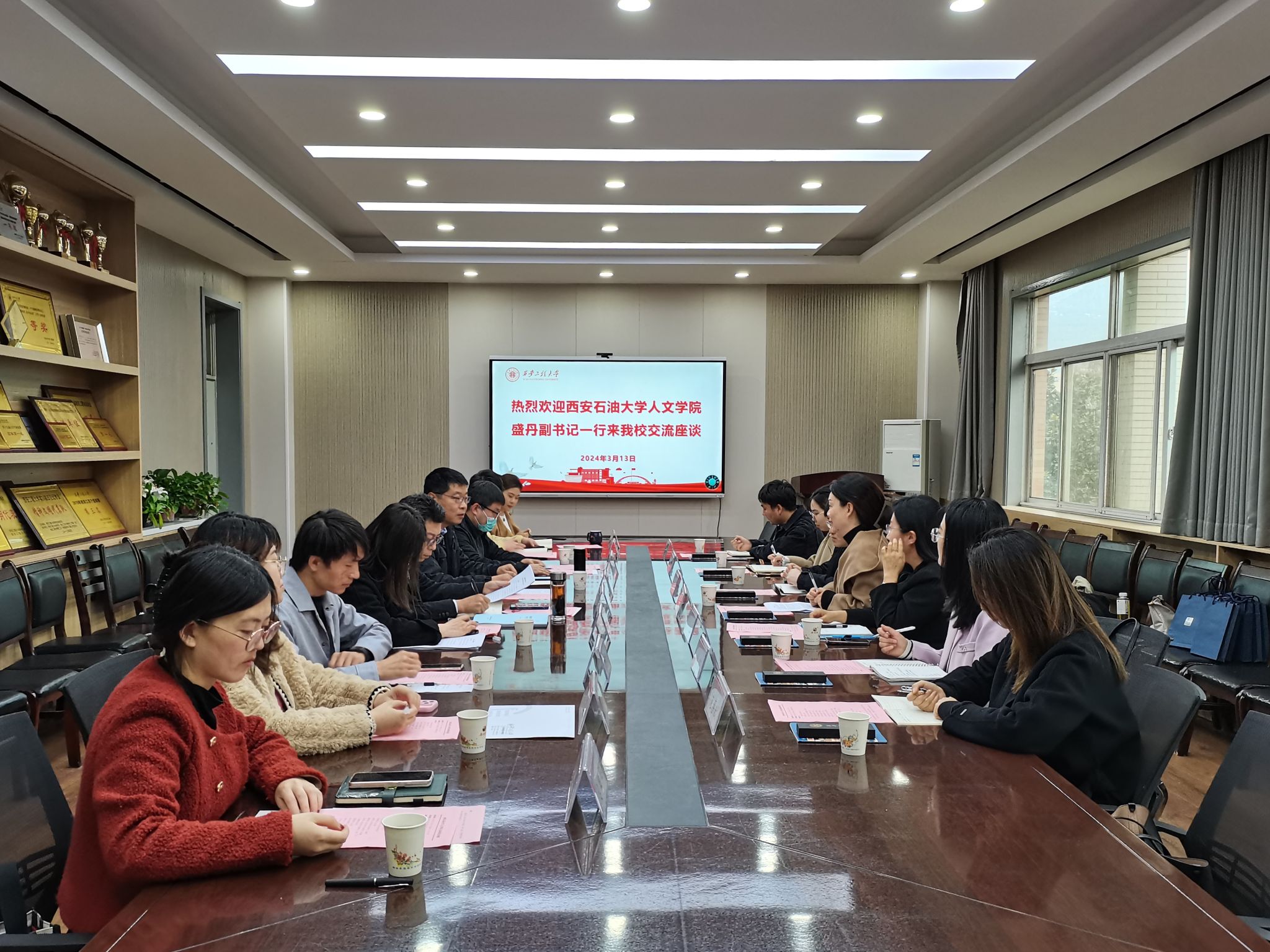 赵立涛代表两院学工队伍对盛丹一行表示热烈欢迎。随后赵文熙和赵立涛分别从永利官网整体人文学科的历史沿革、学院学生工作模式、促进学生全面发展探索等对永利官网两个学院做了介绍。盛丹详细阐述了西安石油大学大学人文学院从成立至今的发展历程以及在文科学生培养、就业方面的改革经验。