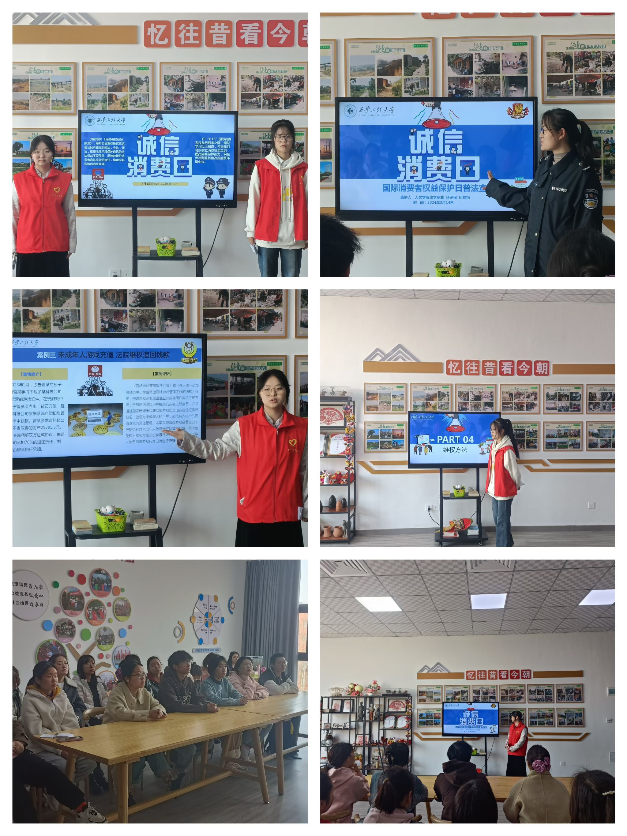 在“3.15”国际消费者权益日到来之际,为进一步强化消费者维权意识,保障广大群众的合法权益,同时加强大学生的社会责任感,3月14日下午,人文学院团委与纺织学院团委联合临潼区司法所在临潼区骊山新家园社区开展国际消费者权益保护法宣讲活动。