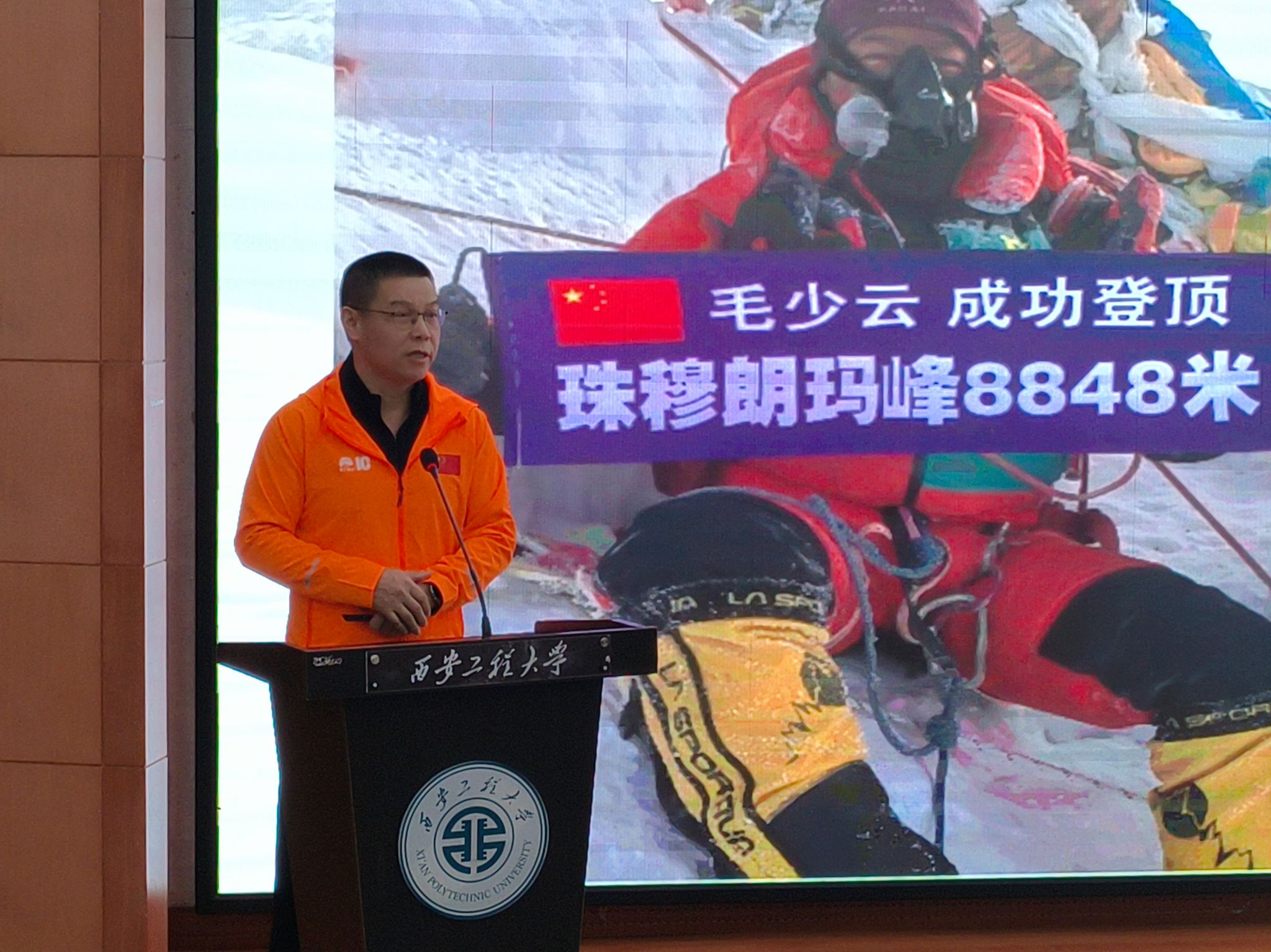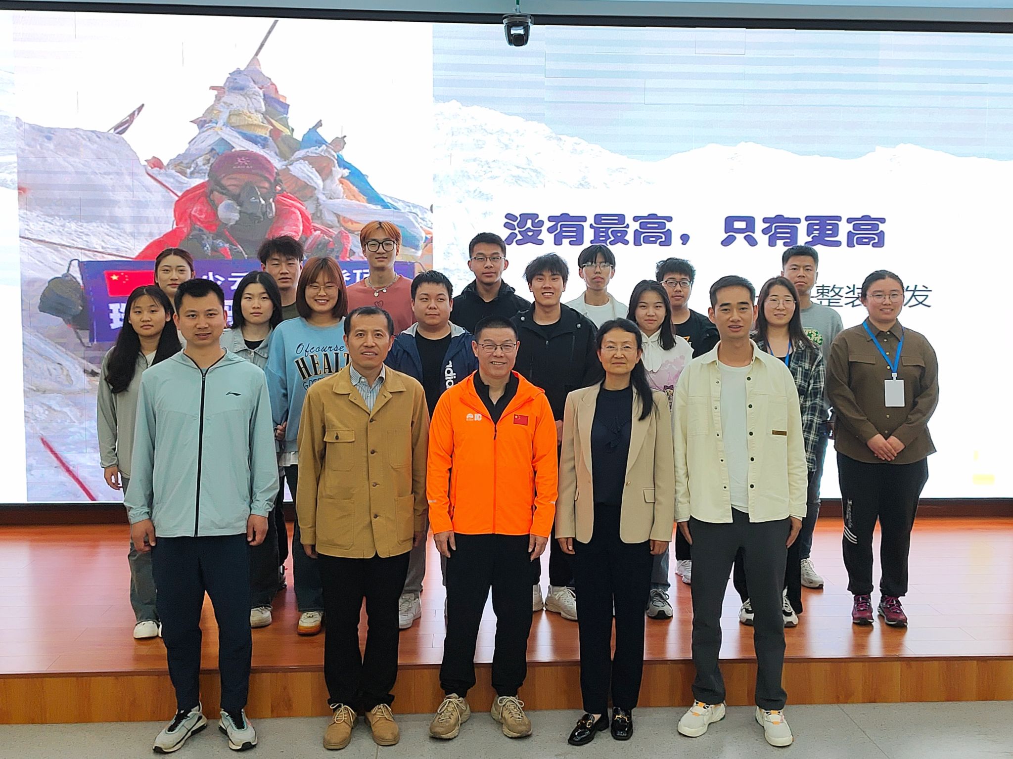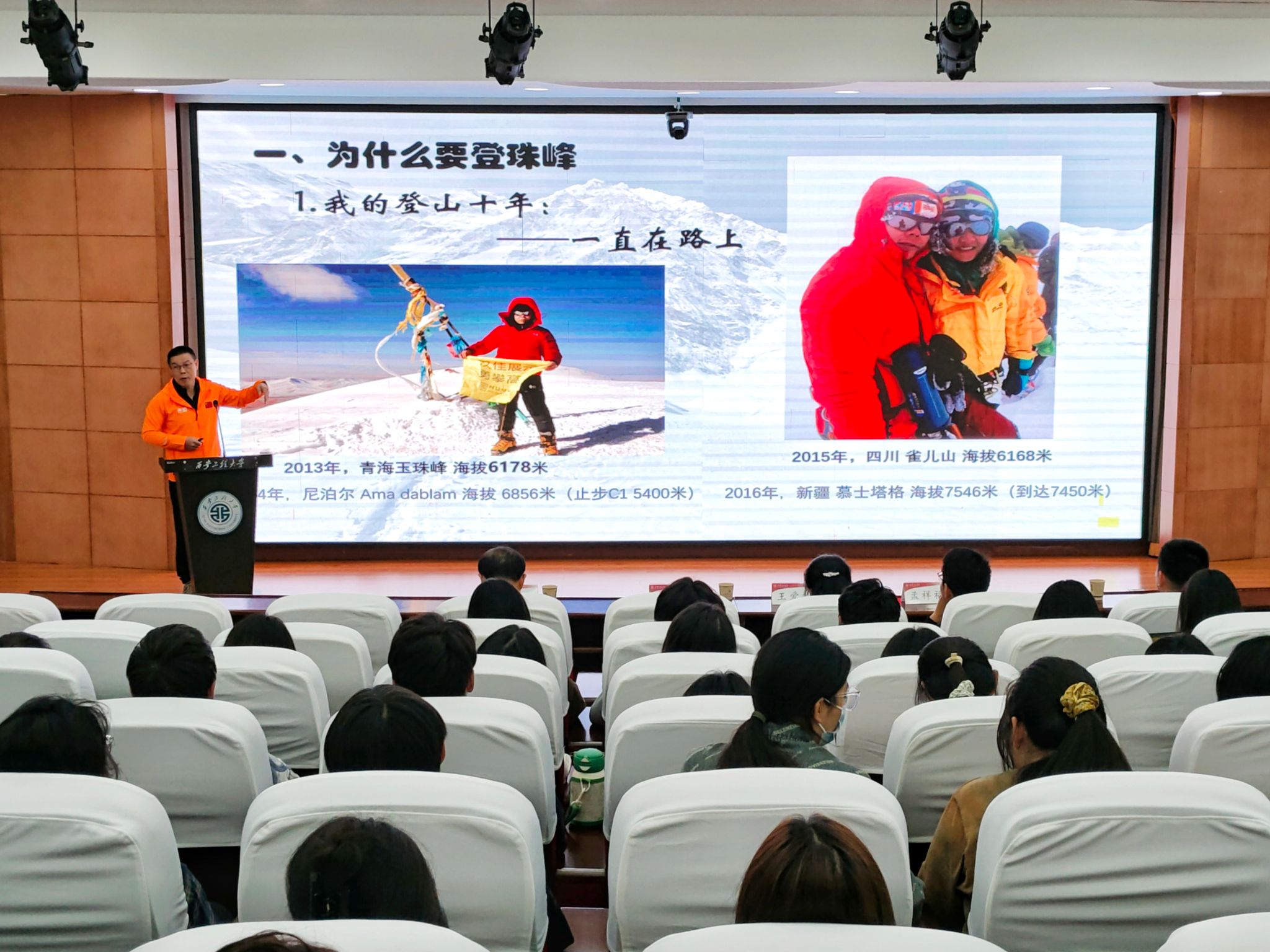 毛少云以“没有最高,只有更高”为题,从“为什么要登珠峰”“珠峰攀登要做哪些准备”“攀登过程”“登后感想”等四方面与师生们一同分享了他本人登山十年,执着追寻个人梦想过程中的努力与付出、遭受的不解与挫折和个人身心变化与成长感受。他讲到,“珠峰都会堵车,人生哪有一路坦途”“目标和信念是人生最有价值的东西”“路要自己一步一步走”“放弃不能成为习惯”,希望学弟学妹们要设立职业发展的长期目标和升学、就业等短期目标,勇往直前,循序渐进,做充分的准备,对自己负责,做到自己的人生自己做主!