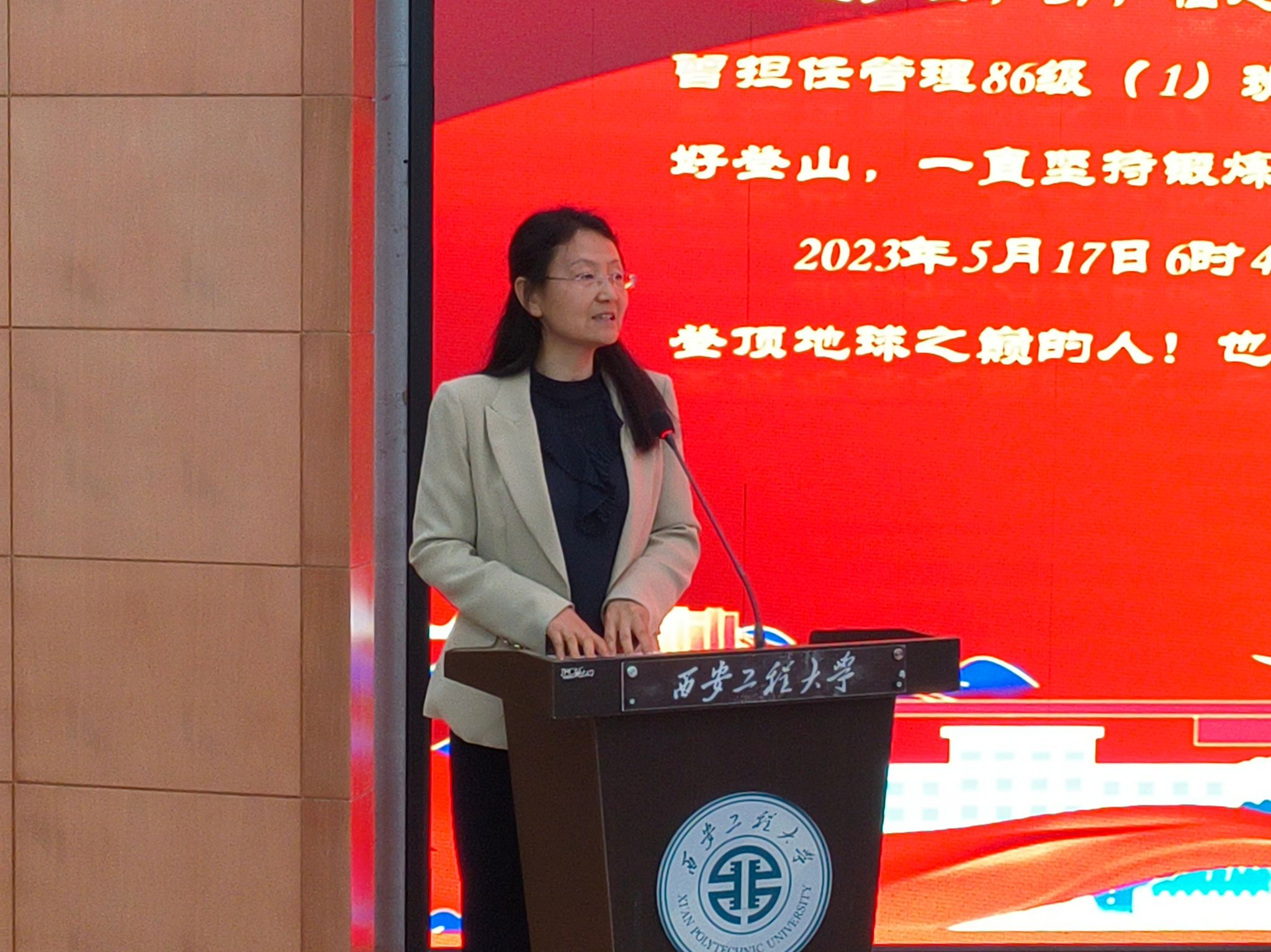 王爱华致词,她代表学院向毛少云致以热烈的欢迎和诚挚的问候,向参会人员简要介绍了毛少云2023年登顶珠穆朗玛峰的精彩经历以及在永利官网师生中引起的广泛影响。她希望到场的同学能够珍惜难得的学习机会,坚定理想信念,在今后的学习、生活中能够坚持不懈,百折不挠,勤学苦练,迎难而上,朝着自己的目标不断向前,去登顶人生的一座座高峰。希望校友能够持续关注母校的发展建设,为母校的发展建设积极建言献策。