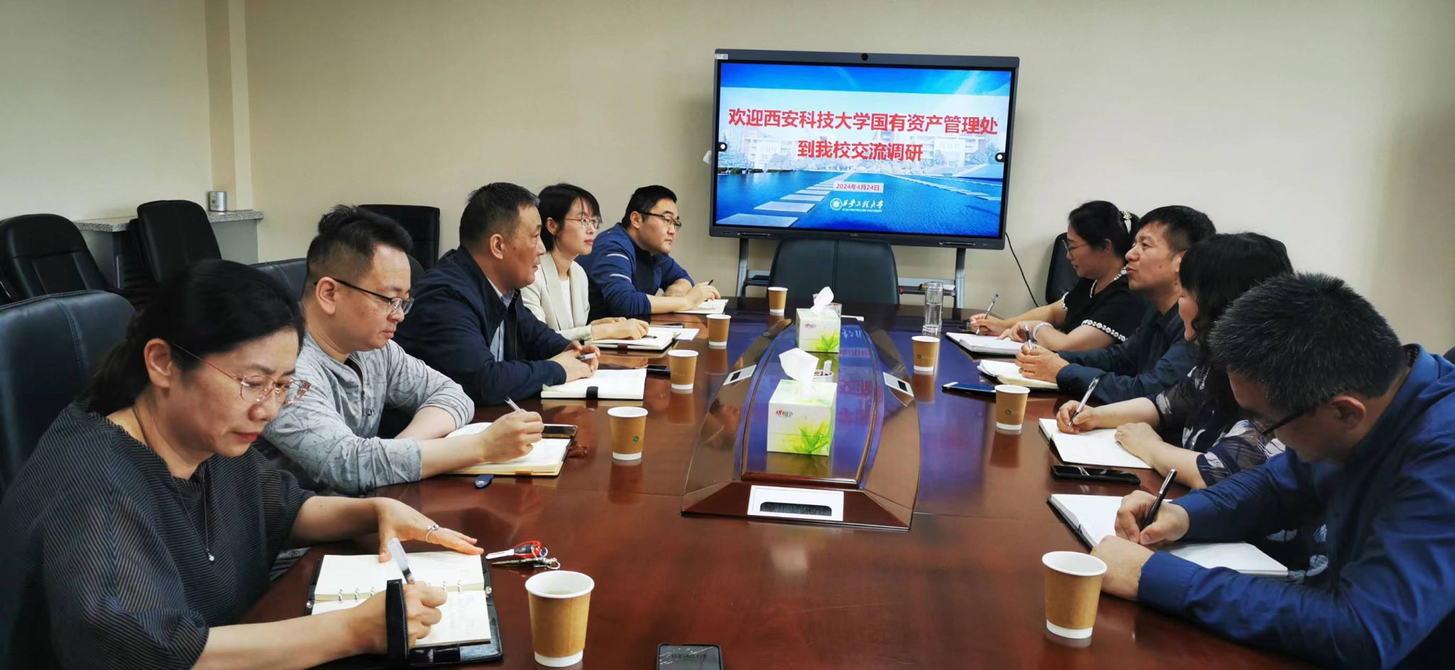 4月24日下午,西安科技大学国有资产管理处处长罗红伟、副处长赵心怡、人事处副处长王文莉一行4人来校调研交流。永利官网实验室管理处处长高飞、副处长刘许,人事处副处长马贵梅,以及实验室管理处科级以上干部等相关人员参加交流座谈。