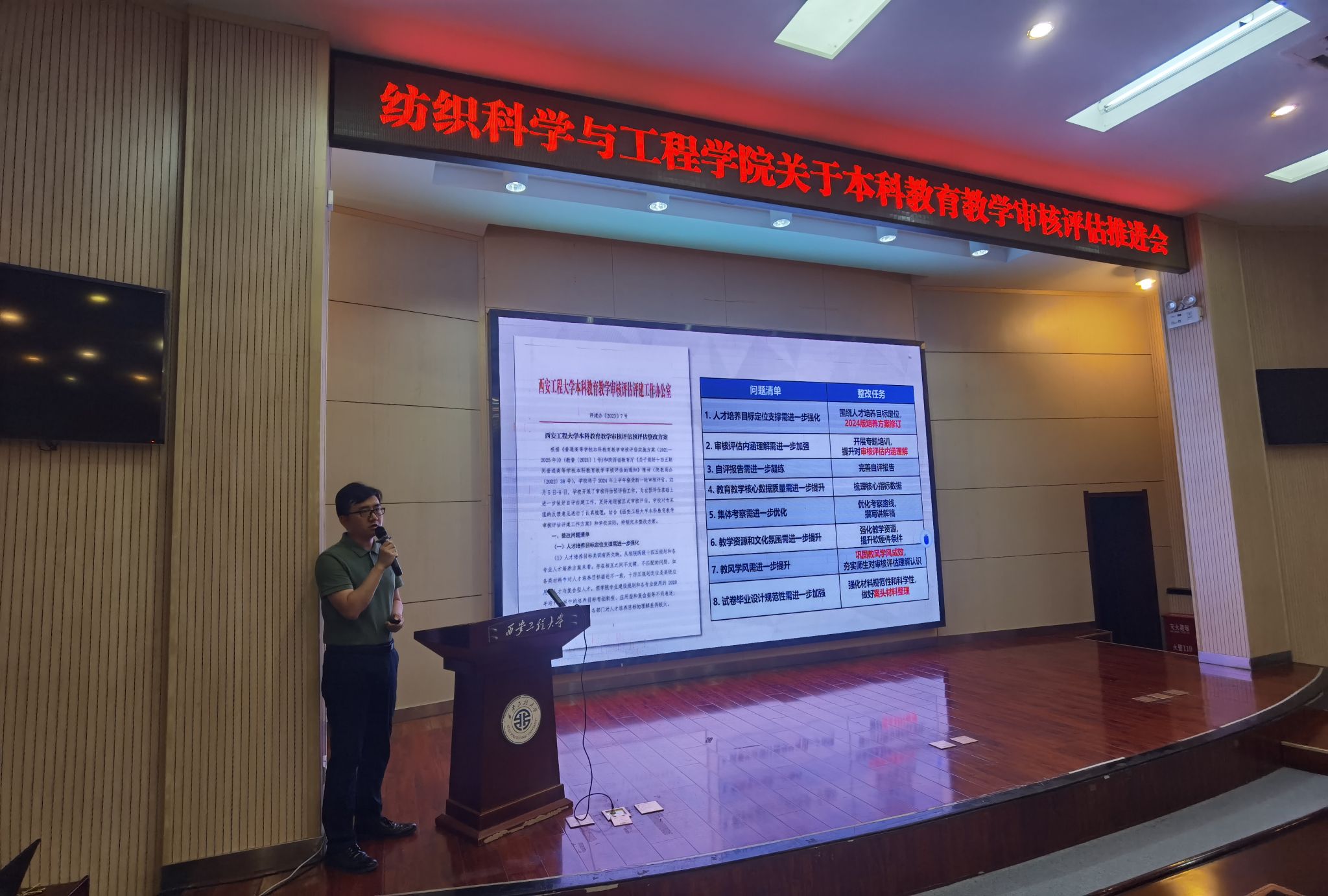 首先,纺织学院副院长师文钊介绍了学院本科教育教学审核评估评建工作整体情况与预评估整改任务落实情况,部署了近期迎评重点工作。重点介绍了学院人才培养目标定位,2024版培养方案修订情况,强化对人才培养目标的支撑,解读《yL23411永利官网登录审核评估应知应会》中相关内容。纺织学院通过开展专题培训,提升学院全体师生对本科教育教学审核评估内涵理解,提升迎评合力,并将持续巩固教风学风对本科教育教学审核评估的理解与认识。永利官网审核评估工作已进入“迎评决战”倒计时,这次会议及时地贯彻落实教育部和学校关于本科教育教学审核评估的文件精神和工作要求,为进一步做好迎接新一轮本科教育教学审核评估各项准备工作指明了方向。
