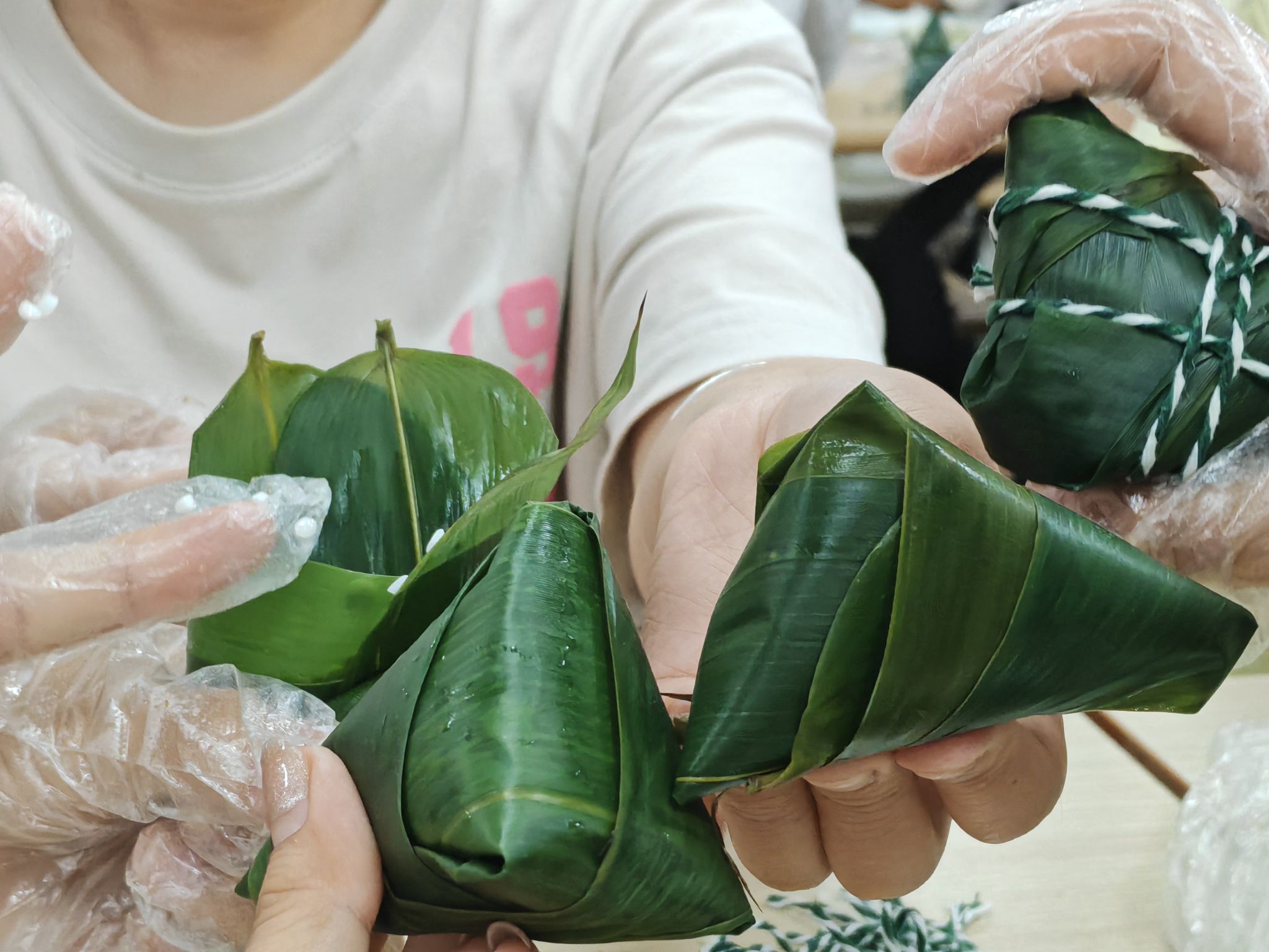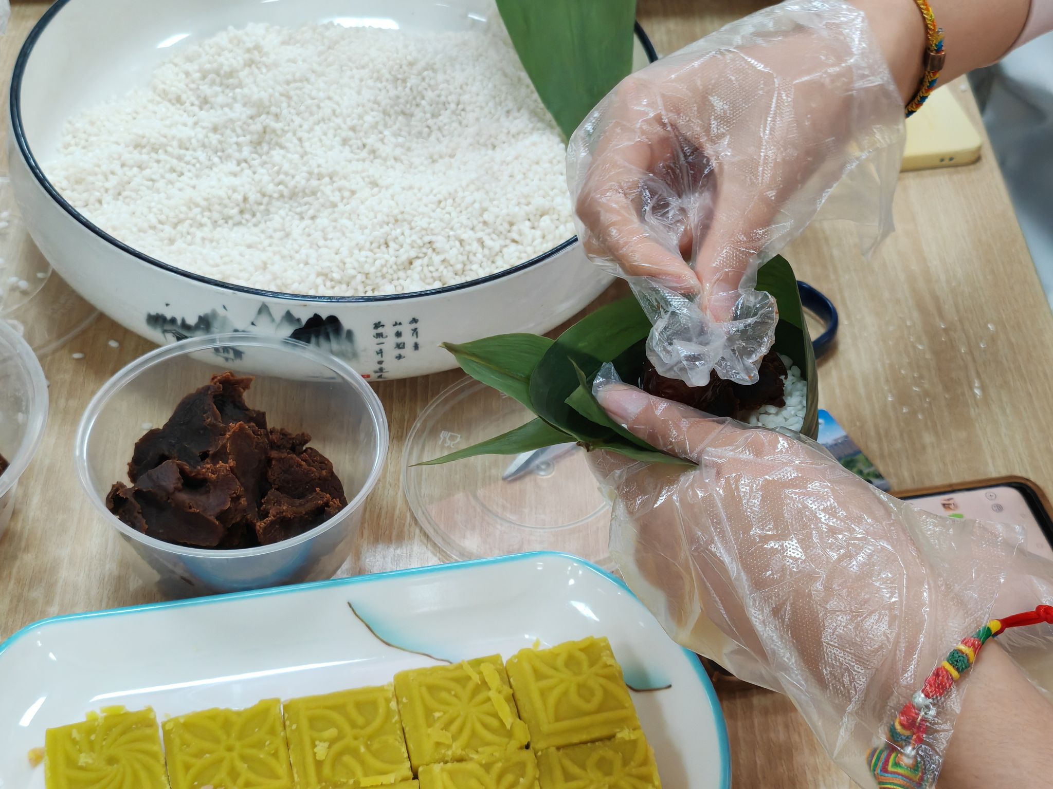 在包粽子、戴花绳活动中,后勤管理处(集团)郭凯杰,学生工作部(处)资助中心王逢云、华宁组织端午节留校的受助学生在综合楼一餐厅包粽子,同学们个个踊跃尝试,现场气氛十分欢乐。一个个看似普普通通香甜的粽子,却在经过很多人的劳动后,才能摆上餐桌,同学们亲手参与整个粽子的制作过程,体验劳动实践带来的成就感和乐趣。