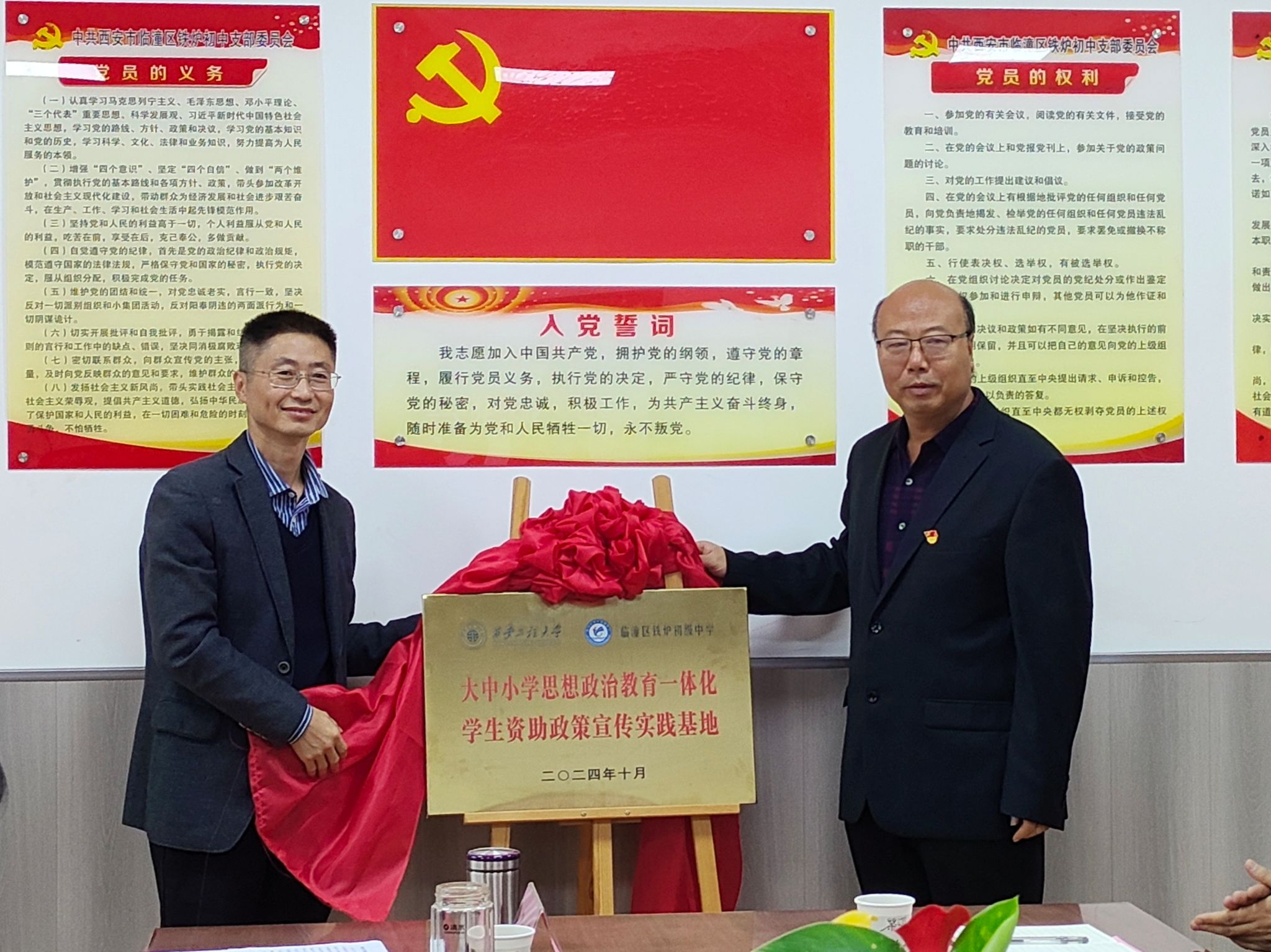 赵宏代表永利官网向铁炉初级中学捐赠价值1万元的文具用品。杨小峰代表铁炉初级中学向永利官网赠送牌匾。王志、杨小峰共同为“大中小学思想政治教育一体化学生资助政策宣传实践基地”揭牌。