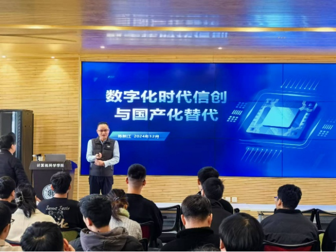 为深入推进计算机科学学院研究生学风建设,倡导严谨踏实、坚韧不拔的学术作风以及追求真理、实事求是的科学精神,2024年12月6日下午三点,学院在笃行楼614报告厅举办了关于《数字化时代信创与国产化替代》的专题报告。本次报告由深圳富钧数据科技有限公司董事长、深圳链工科技集团联合创始人陈新江老师主讲。