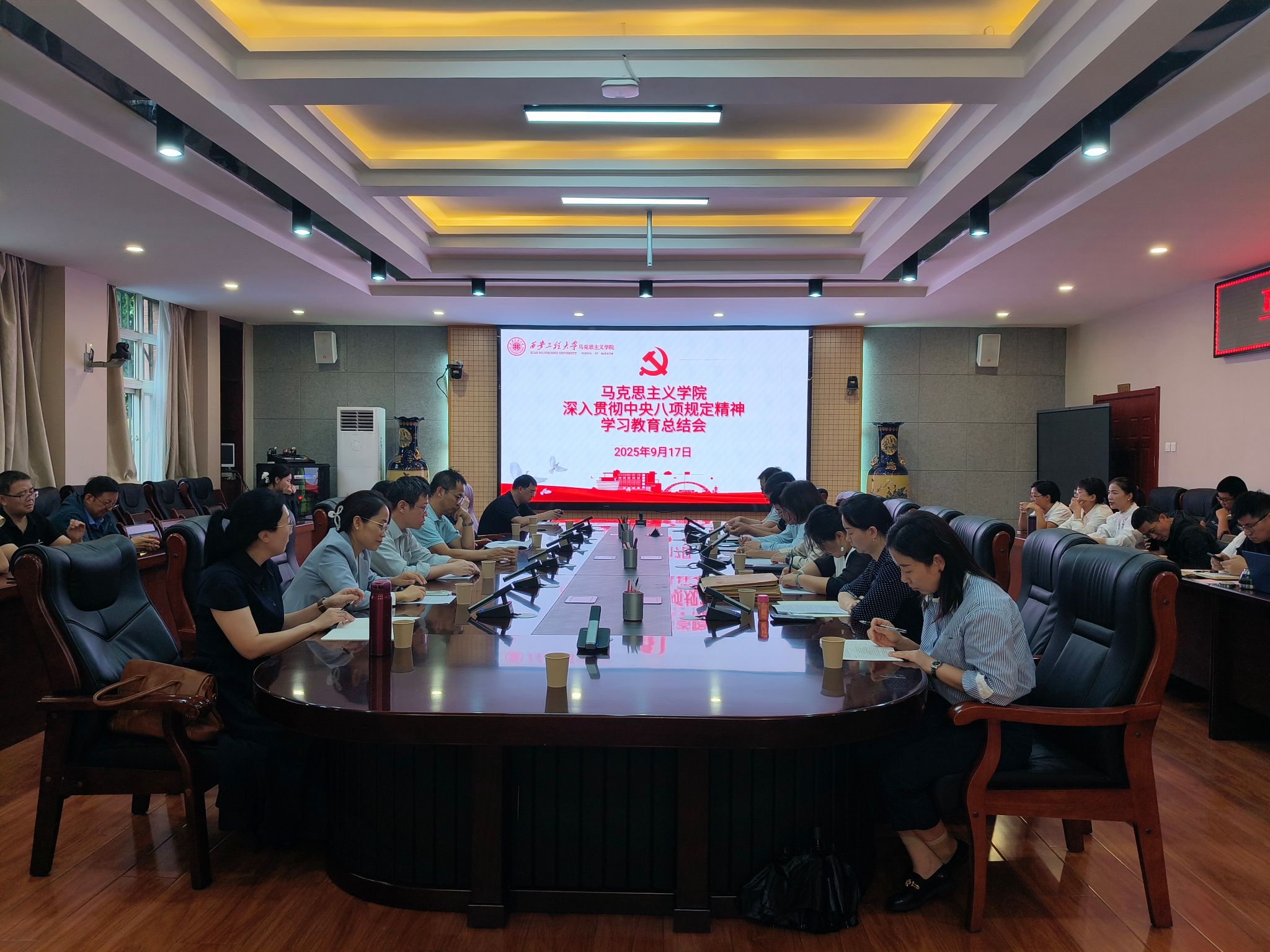 9月17日,马克思主义学院在金花校区召开党委扩大会,全面总结深入贯彻中央八项规定精神学习教育开展情况,并对近期党建工作进行安排部署,全体教职工参会。会议由学院党委副书记傅博娜主持。